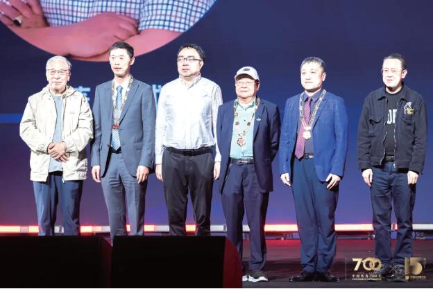 颁奖典礼现场,王晋康(左一)、何夕(左三)、韩松(左六)向董仁威(左四)、吴岩(左五)、姚海军(左二)颁发“星云十五”创始纪念勋章